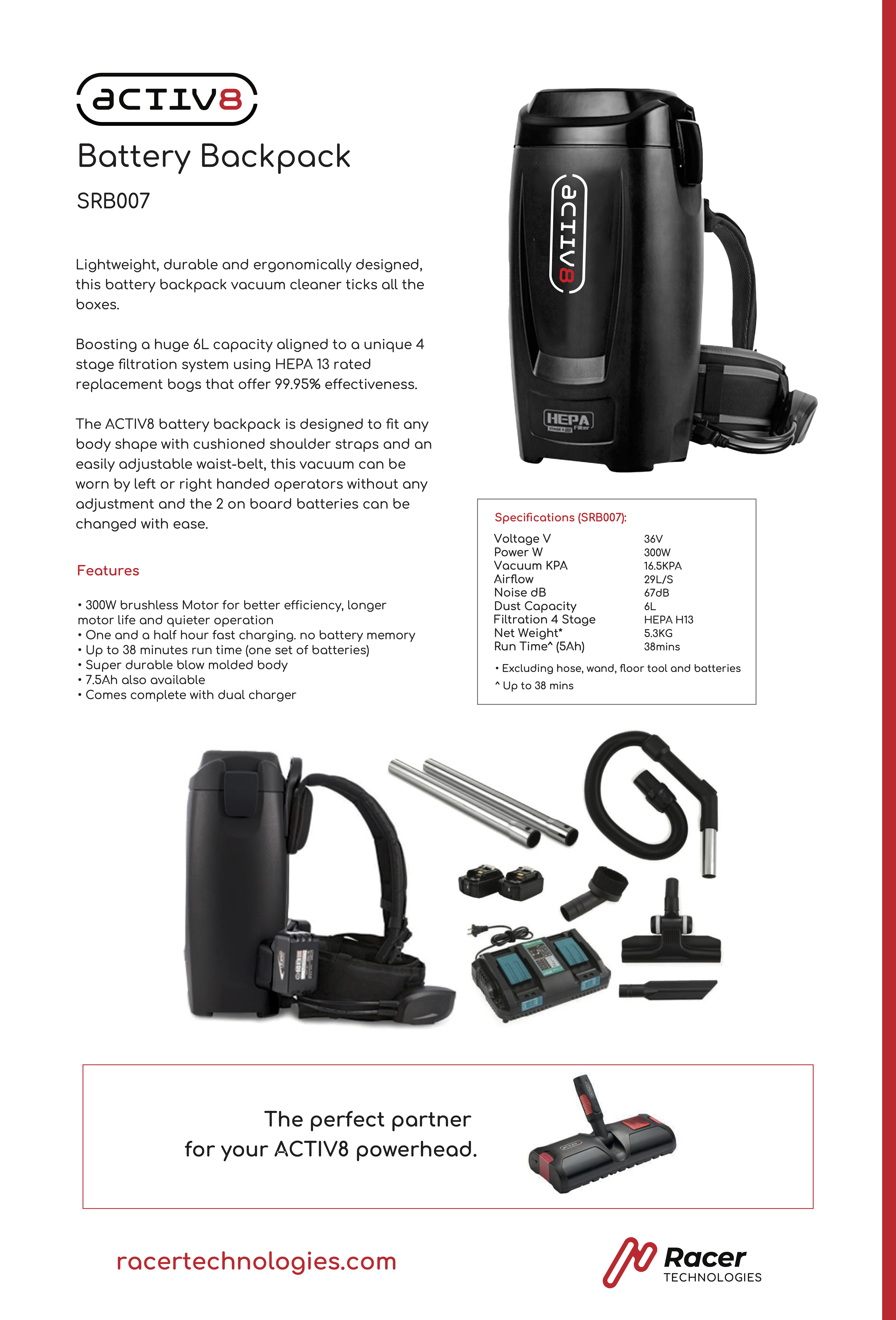 ACTIV8 is a world-first battery-powered dual-brush vacuum powerhead designed for backpack vacuums. Glide in any direction and double your coverage with less strain.